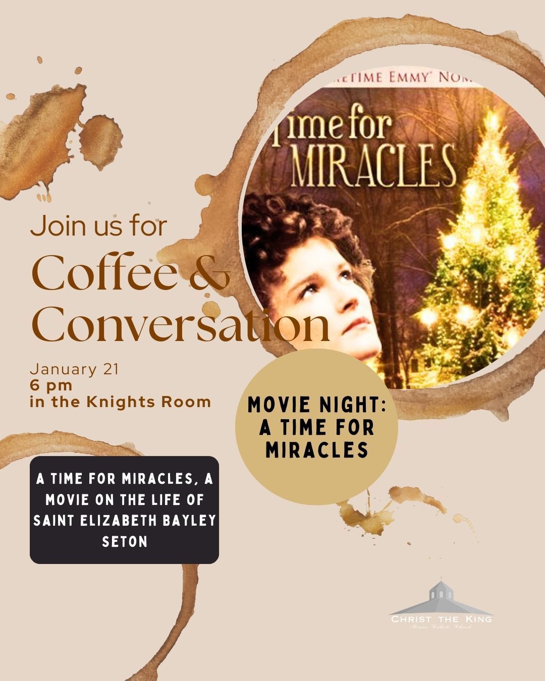 Presenting a movie on the life of Saint Elizabeth Bayley Seton. The movie titled “A Time for Miracles” tells her inspiring story - one filled with the tragedy of loss and the triumph of faith. Come and join us for snacks and watch this beautiful story of how Catholic education for all began.
