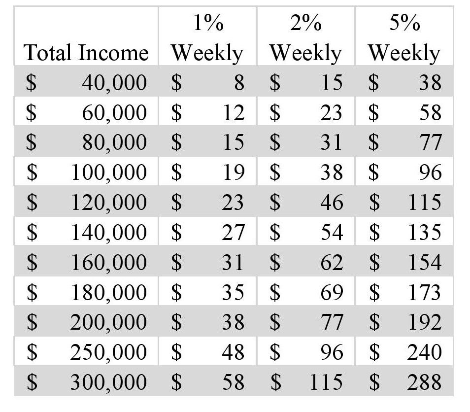Data shows that most Catholics in general contribute less than 1% of gross household income, while Protestants donate more than 2% and Evangelicals contribute 5%. Each person must prayerfully decide on their contribution level. You may find this chart a helpful guide.